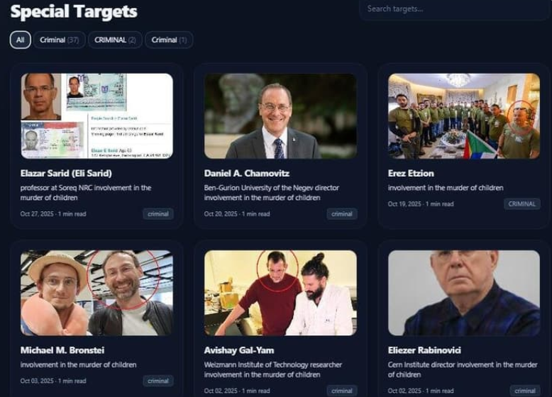 אתר אנונימי פרסם רשימת “יעדי חיסול”: 100 אלף דולר תמורת רצח אקדמאים ישראלים*זעזוע בעולם האקדמיה הישראלי: אתר אינטרנט אנונימי בשם The Punishment For Justice Movement מפרסם איומים חמורים וממוקדים ברצח אקדמאים ישראלים בכירים, תוך שהוא מציג אותם כ”פושעים ומשתפי פעולה עם צבא הכיבוש pic.twitter.com/wTEMvZCtKN