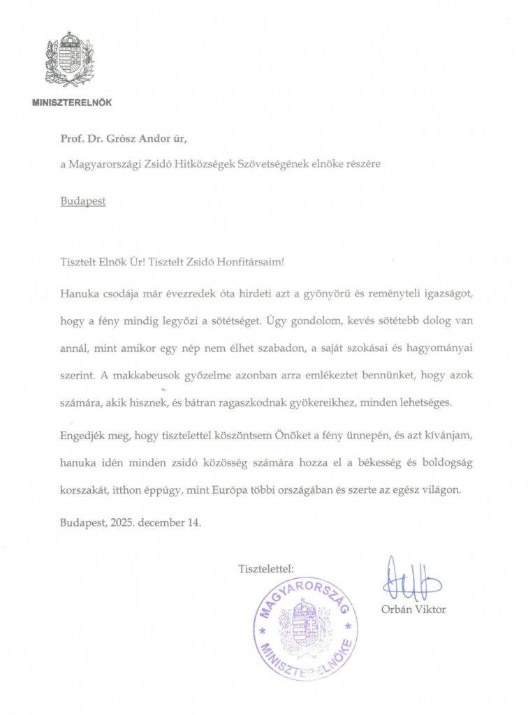 Orbán Viktor miniszterelnök köszöntötte hanuka alkalmából a honi zsidó közösségeket.