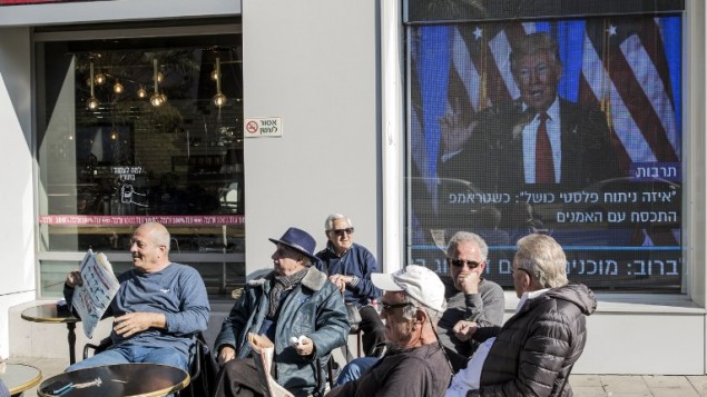Izraeliek egy kávéház előtt ülve hallgatják Trump beszédét