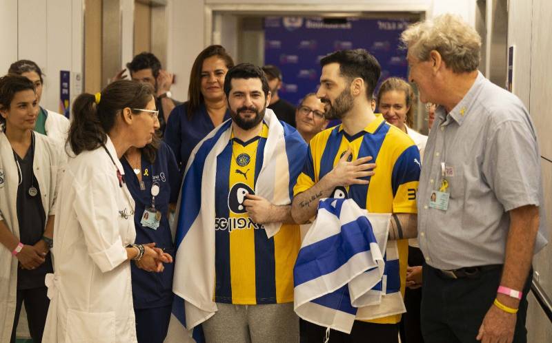 Matan Angrest a kórházban, miután 2025. október 13-án szabadult fogságából. (Kormányzati Sajtóiroda)