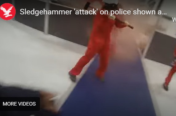 A felvételeken jól látszik, amint az egyik piros overallba öltözött aktivista egy épületek bontásához használatos pöröllyel kétszer is csapást mér egy rendőrre, mielőtt annak társai sokkolópisztollyal meglövik, illetve a földre teperik és megbilincselik.