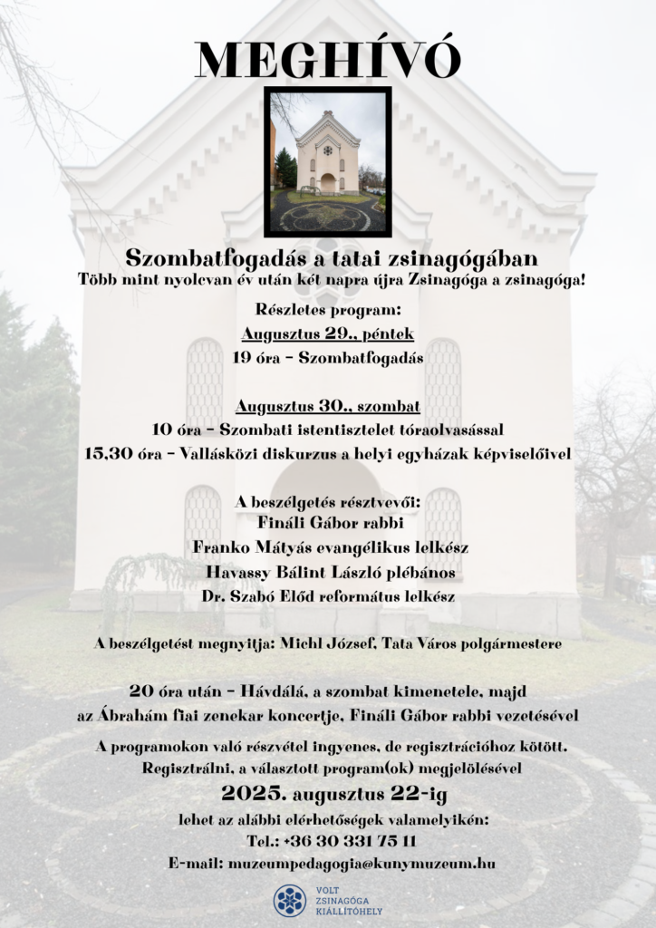 2025. augusztus 29-én és 30-án szombatfogadás, tóraolvasás, zsidó szokások szerinti imák és vallásközi diskurzus Tata közel 165 éves zsinagógájában.