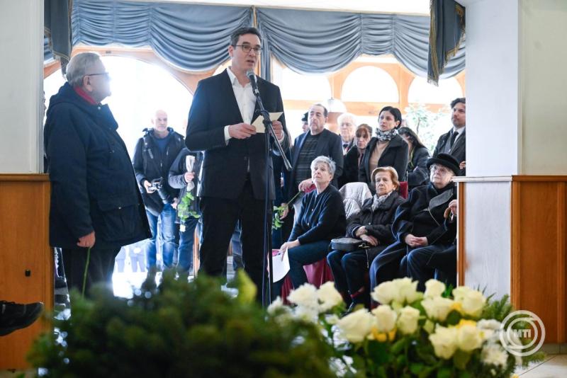 Karácsony Gergely főpolgármester gyászbeszédet mond Keleti Éva Kossuth- és Balázs Béla-díjas fotográfus ravatalánál az Óbudai temetőben 2026. március 4-én. Az érdemes és kiváló művész életének 95. évében, 2026. február 6-án hunyt el. MTI/Bruzák Noémi