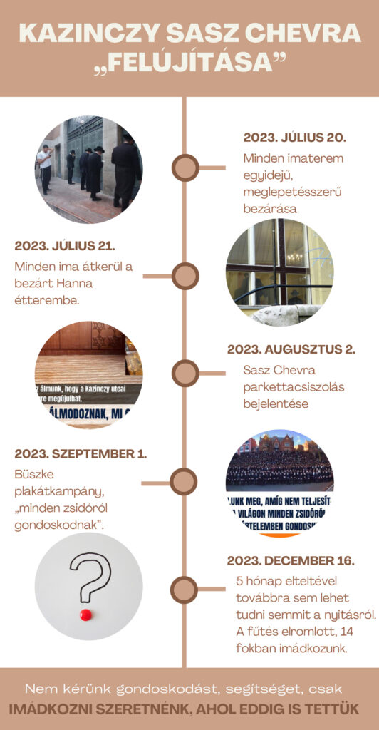 A „Sasz Chevra” nevű kis imaház a Kazinczy utcai zsinagóga épületegyüttesének a része. A MAOIH új, EMIH-közeli vezetése még július 20-án lezáratta, felújításra hivatkozva. Felújítás azóta (öt hónapja) nem történt – leszámítva a teljes felszerelés eltávolítását és a parketta felcsiszolását.