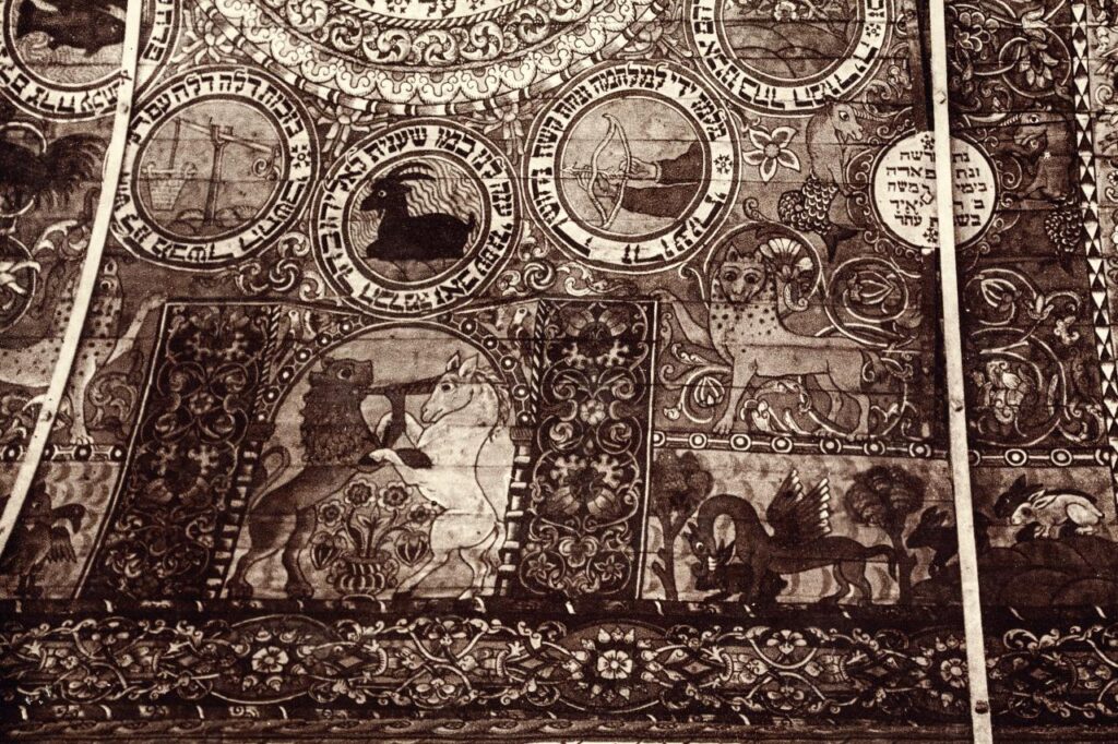 Az 1652-ben épült Chodorow zsinagóga teljes egészében fából készült. 1714-ben egy jaryczówi művész festette ki a zsinagóga belsejét, fényes folklórfestményekkel. Egy élénken festett oroszlán és unikornis úgy néznek szembe egymással, mintha táncolnának. Három nyúl végtelen körben kergeti egymást, hosszú fülük belső háromszöget alkot. Bölcs kinézetű medve kényelmesen ül egy gyönyörűen virágzó szőlő között, körülötte fényes madarak kóborolnak. Ebben az állatkönyvben az összes állatot piros, arany és zöld meleg árnyalatúra festették.Köszönhető a Tel Avivi Beth Hatefutsothnak és a Chodorow mennyezet gyönyörűen rekonstruált teljes színű modelljének, hogy még mindig láthatjuk és értékelhetjük azokat az élénk színeket és művésziességet, amelyek egykor a lerombolt zsinagógát díszítették.