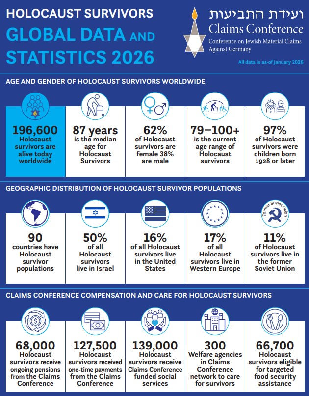A két évvel ezelőtt nyilvántartott 245 ezer holokauszt-túlélő mintegy egyötöde azóta eltávozott: jelenleg a világ 90 országában összesen 196 ezer túlélőt tartanak számon. Ez a szám a 2025 januárjában becsült 220 ezer főhöz képest is jelentős csökkenés.