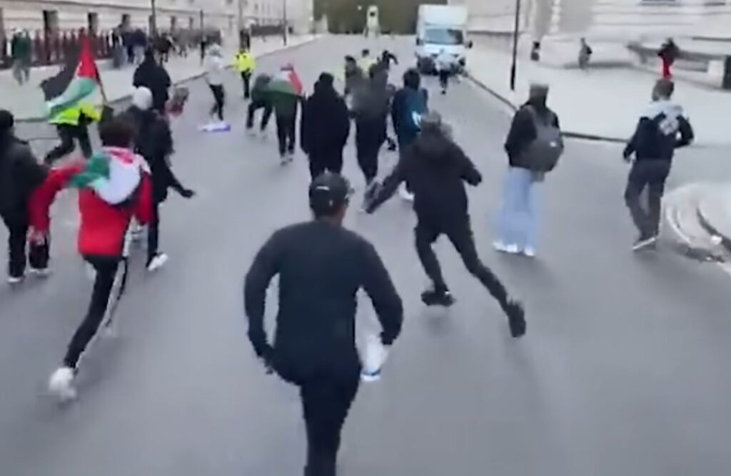 London: palesztinpárti tüntetők üldözőbe vesznek egy izraeli zászlót lengető ellentüntetőt Londonban (Screenshot)