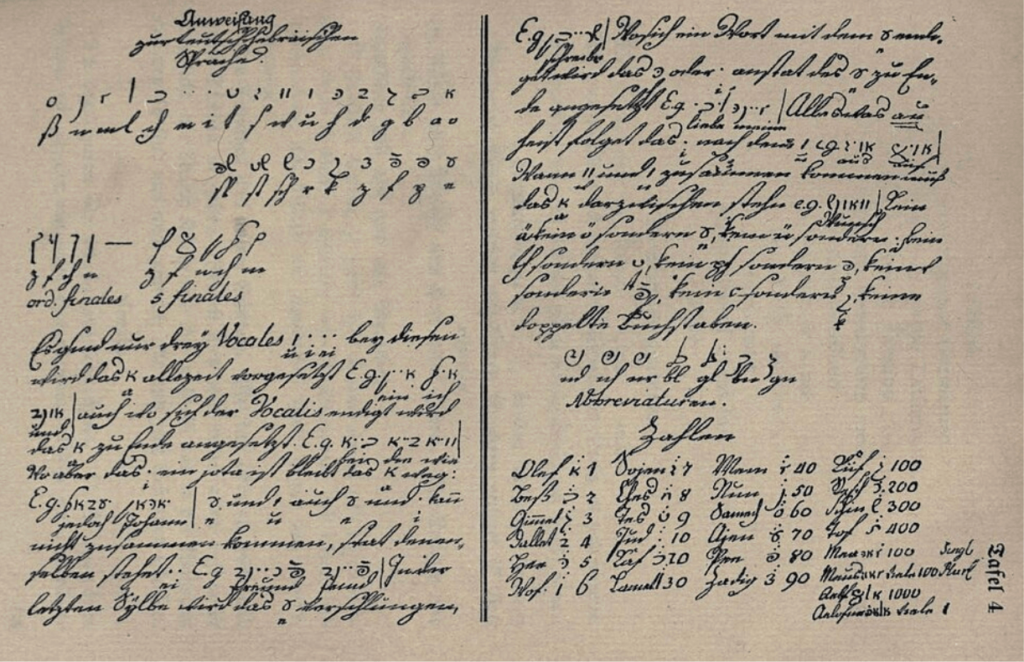 Goethe hamar felismerte, hogy ha valóban meg akarja érteni a jiddist, akkor héberül is meg kell tanulnia. Apja tanárt fogadott mellé, és a fiatal Goethe belevetette magát egy teljesen új ábécébe. Bár gyermekkori füzeteinek pontos holléte ismeretlen, két oldaluk elérhető az interneten. Ezeken gondosan leírja a héber betűket, nevüket, hangértéküket és még számszerű jelentésüket is. Jegyzetfüzetében emlékezteti magát arra, hogy a héber szavak hárombetűs gyökökből épülnek fel, és újra meg újra gyakorlásra buzdítja magát, hogy a formák rögzüljenek az emlékezetében. Nem volt könnyű. Később azt írta, hogy megszokta a jobbról balra olvasást és a betűk felismerését, de a sok pont és vonás – a magánhangzójelölések – összezavarták. Ennek ellenére kitartott: megtanulta olvasni a héber Bibliát, és még egy német nyelvű eposz megírásával is próbálkozott a Teremtés könyvének történetei alapján.