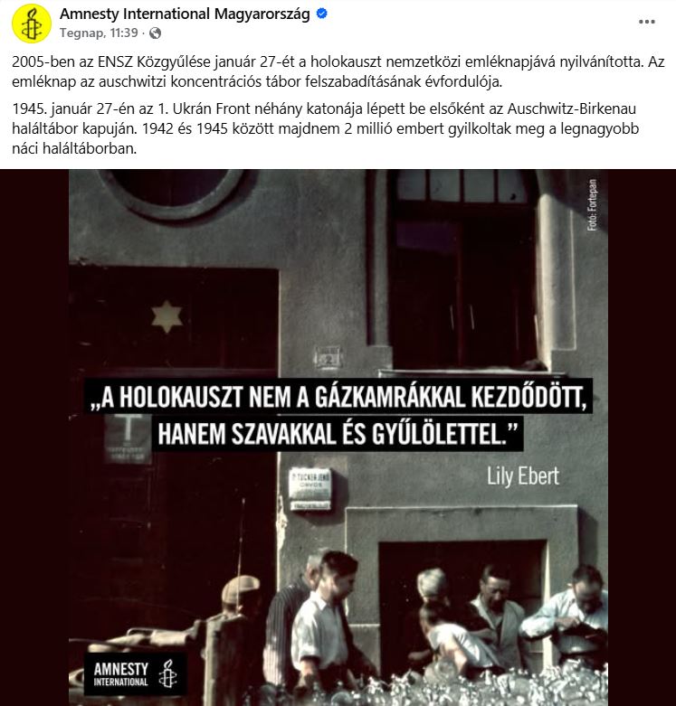 AZ Amnesty International magyarországi szervezete facebook oldalán kétmondatos posztban említi meg a Holokauszt nemzetközi emléknapját.