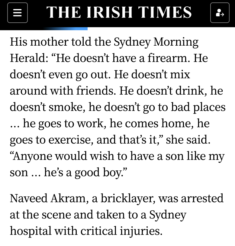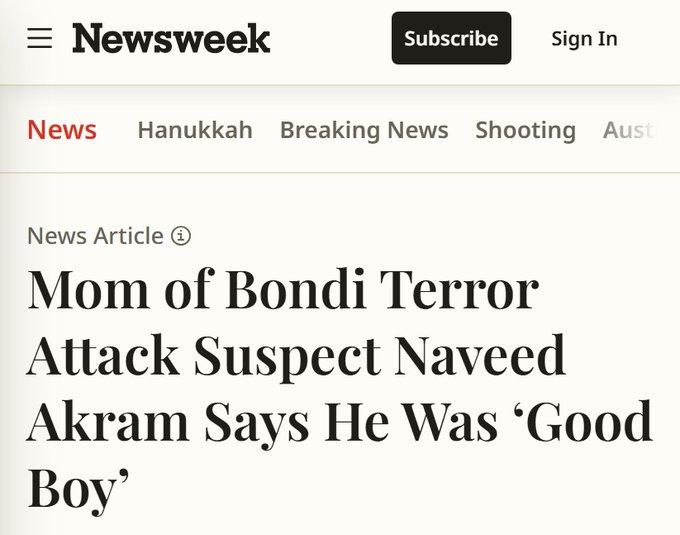 A Newsweek egyik címe a támadó és családja kapcsolatára fókuszált, azt idézve, hogy az anyja „jó fiúnak” tartotta. Csakhogy nem annak kellene vezető hírnek lennie, amit az anyja gondolt róla a támadás előtt, hanem annak a ténynek, hogy tömeggyilkosságban vett részt egy hanukai eseményen. Az áldozatok családjainak fájdalma és a túlélők traumája érdemelte volna a történet középpontját, nem pedig a terrorista érzelmi jellemzése.