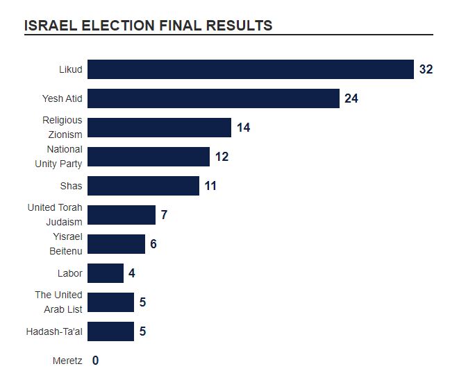 A Likud 32 mandátumot szerzett, míg a leköszönő miniszterelnök, Jair Lapid Jesh Atid pártja 24 mandátummal a második legnagyobb párt, amelyet a szélsőjobboldali Vallásos Cionizmus követ, amely 14 mandátumot szerzett.
