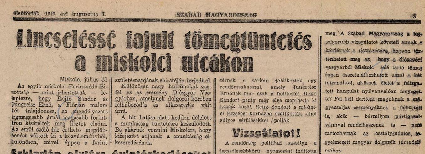- július 30-án a lincselésbe torkolló „forintvédő” tüntetés feloszlásától kezdve Miskolcon felgyorsultak az események. Felszínre törtek az elfojtott, agresszív ösztönök és a lappangó zsidógyűlölet. Mivel a lincselésnél az egyenruhás rendőrök tétlenek maradtak, általános volt a felháborodás, amikor aznap este kiderült, hogy a „népítéletet” megtorlás követi. A vasgyáriak úgy érezték, hogy becsapták őket. Meg voltak győződve arról, hogy a társaik, akiket őrizetbe vettek a lincselésben való részvételük miatt, valójában áldozatok, akiket aljasul „beugrattak”. A munkásszolidaritás gyűlöletet ébresztett a zsidók és a rendőrség ellen.