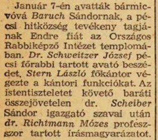 Érdekes epizód, hogy a pécsi Baruch Endre bármicvóját Schweitzer József a pesti Rabbiképző zsinagógájában tartotta 1961. január 7-én, Scheiber Sándor és Richtmann Mózes jelenlétében.[16] A Baruch-család a Budapesten élő rokonság miatt a fővárosban szerette volna megtartani a bármicvót. Az ünnepelt azonban ragaszkodott (a mai napig) hőn szeretett felkészítő rabbijához. Így aztán – feltehetőleg Schweitzer kezdeményezésére – a Rabbiképző zsinagógája adott otthont a szertartásnak.[17] Ez a mozzanat is illusztrálja Scheiber és Schweitzer szoros munkakapcsolatát.