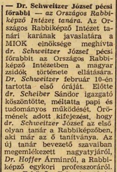 Rövidhír: Schweitzer József a Rabbiképző oktatója. Új Élet, 1966. március 1., p. 6. (Arcanum).